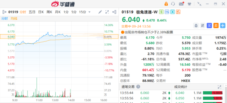 极兔速递 $01519.HK 涨幅一度扩大逾10%,截至发稿,涨8.44%,报6.04港元,成交额1.17亿港元。