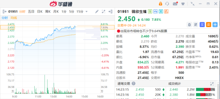 锦欣生殖 $01951.HK 涨超7%,截至发稿,涨7.93%,报2.45港元,成交额4040万港元。