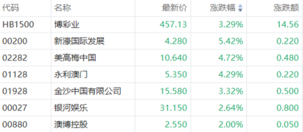 博彩股普遍走高,截至发稿,新濠国际发展超5%,美高梅中国、永利澳门涨超4%,金沙中国涨超3%,银河娱乐涨超2%。