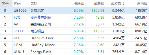有色金属板块走高,截至发稿,麦克莫兰铜金、南方铜业、美国铝业涨超7%,淡水河谷、世纪铝业涨超6%,力拓、必和必拓涨超4.8%。