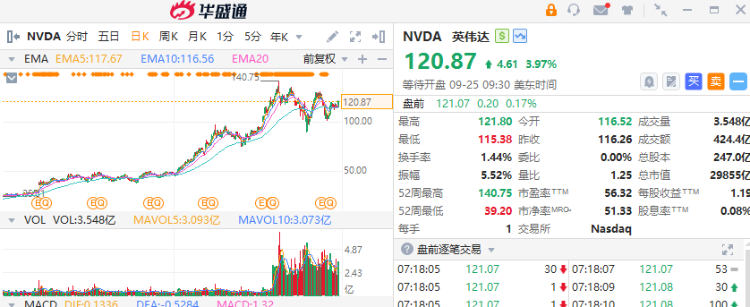 截至当地时间9月24日收盘,英伟达报120.87美元,涨幅3.97%,市值一夜大增1131亿美元(约合人民币7953亿元)。