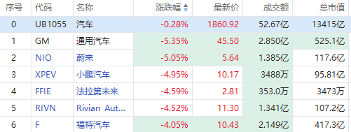 美股汽车股盘初走弱,截至发稿,通用汽车(GM)跌5.97%,Rivian(RIVN)跌5.19%,福特(F)跌4.76%。