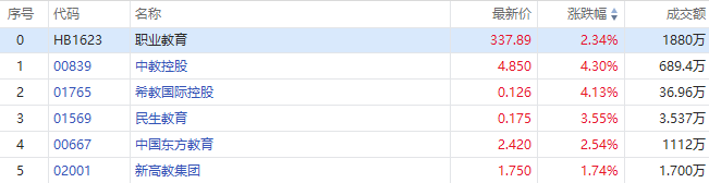 9月26日,教育股涨幅居前,截至发稿,希教国际控股、中教控股涨超4%,民生教育涨近4%,中国东方教育涨超2%,新高教集团涨超1%。