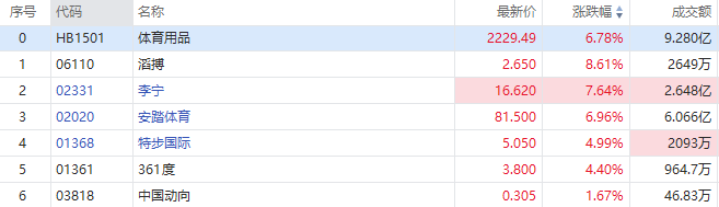 9月26日,体育用品股涨幅居前,截至发稿,滔搏涨近9%,李宁涨近8%,安踏体育涨近7%,特步国际、361度涨超4%。
