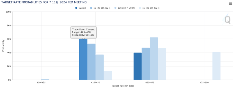据芝加哥商品交易所CME统计:截止本文发稿,11月降息50基点的概率已经达到60%,一周前还仅有37%。