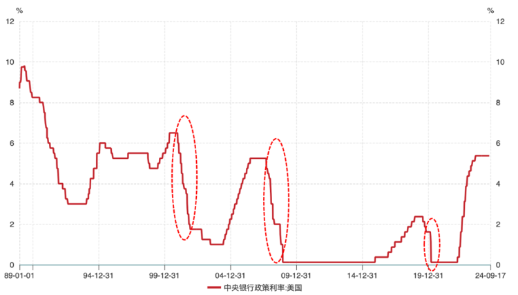 历史上,每一轮美联储降息周期期间,单次降息幅度都尽可能保持相同幅度,以25bps为基本单位,只有当经济发生了重大变化,美联储才会有意加快宽松步伐。其中,最有代表性的包括:2001年的8次50bp降息,2007-2009年间的3次50bp、1次75bp、1次100bp、1次125bp降息,以及2020年3月的150bp降息。