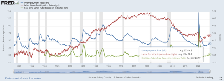 但是如今,美国劳动参与率基本见顶,失业率也出现明显上升苗头,萨姆实时衰退指标更是连续两个月站上0.5%警戒线。