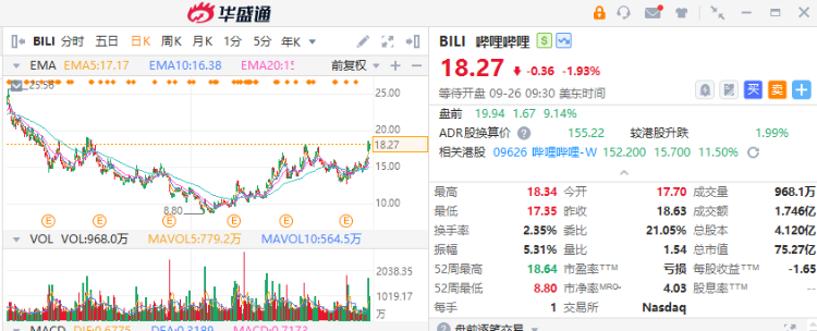 此外,摩根士丹利发表报告指出,哔哩哔哩短期因素正面,如《三毛》第三季(由9月22日开始)的上升空间、强劲的广告、收支平衡的利润上升空间,以及平均每日活跃用户(DAU)和总花费时间不断扩大。该行将其目标价由15美元上调至20美元,维持“与大市同步”评级。