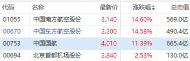 受益于十一黄金周出行潮,港股航空板块多数走强。截至发稿,中国南方航空股份、中国东方航空股份涨超14%,中国国航涨超11%,北京首都机场股份涨超2%。