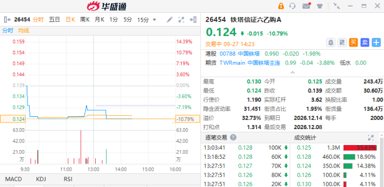 个股方面,大市升势全面,个别蓝筹股升幅更达双位数,部份资金转吼走势落后的股份,包括中国铁塔 $00788.HK ,股价曾逆市向下,跌近3%,于“蚊股”及“毫子股”之间上落。即市资金吼位追入相关好仓,可以留意铁塔认购证 $26454.HK ,行使价1.19港元,属于长年期的选择,2026年年底才到期,但亦能提供约3.5倍的实际槓杆。