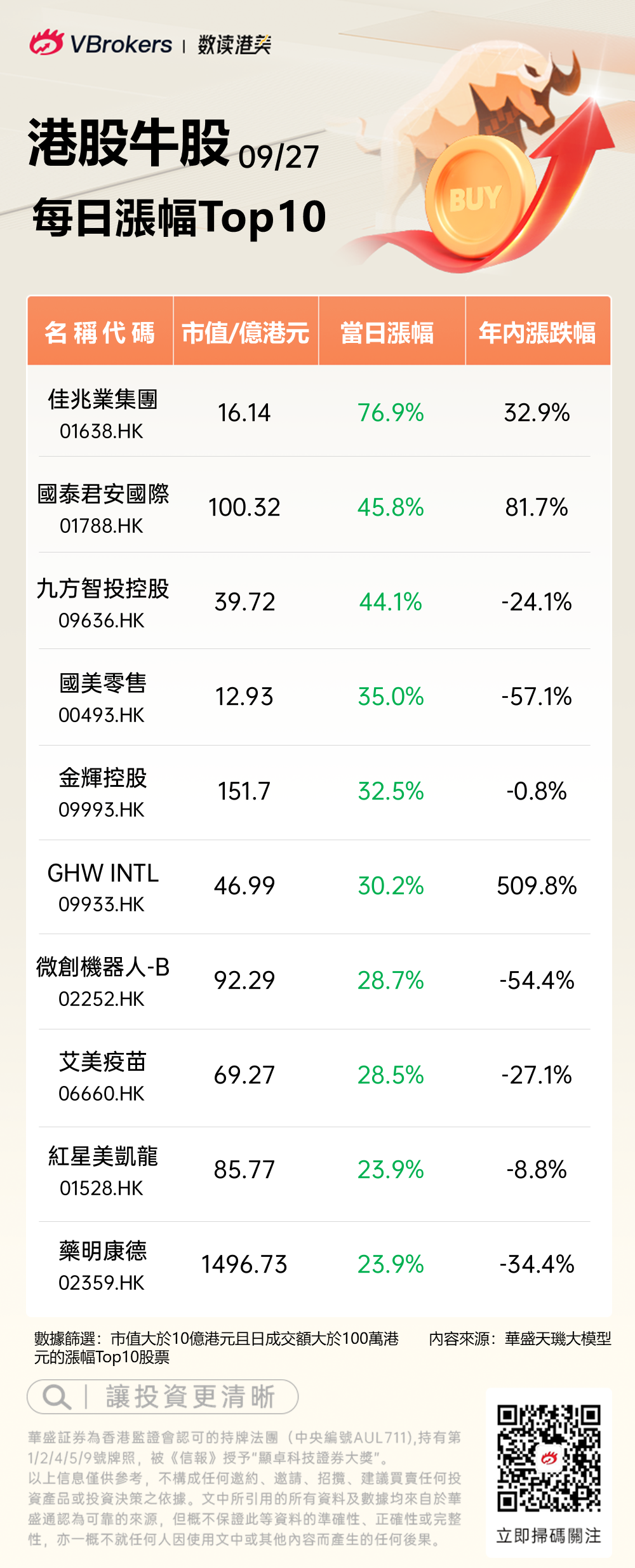 發仔统计了每日港股涨幅Top10,具体名单如下: