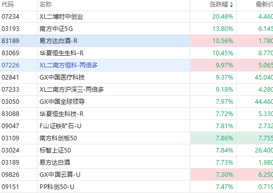 追踪A、H股指数ETF狂涨。其中,XL二博时中创业ETF飙升20%,易方达白酒-R、华夏恒生生科-R涨超10%,XL二南方恒科-两倍多、XL二南方沪深三-两倍多大涨9%,南方科创板50、标智上证50等跟涨。