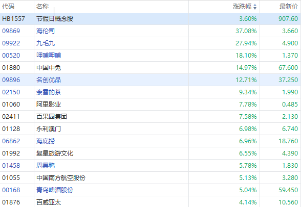 国庆节临近,假日概念股集体走高。餐饮方面,海伦司涨超37%,九毛九涨超27%,呷哺呷哺涨超18%,中国中免涨超14%,名创优品涨超12%,奈雪的茶涨超9%,阿里影业涨超7%。