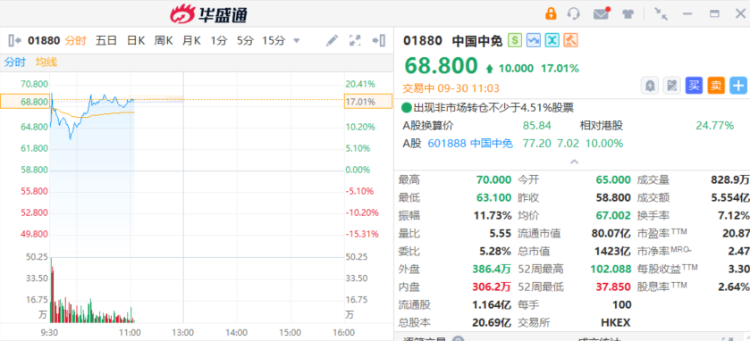 中国中免 $01880.HK 涨超16%,截至发稿,17.01%,报68.8港元,成交额5.554亿港元。