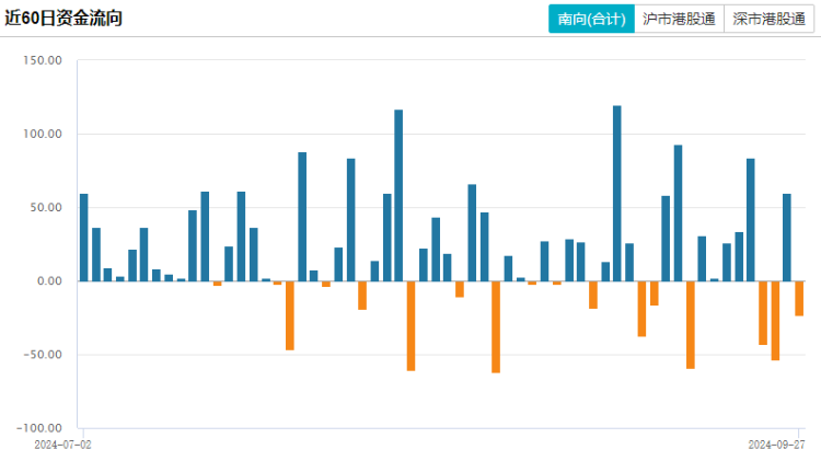 从资金动向来看,截至9月27日收盘,北水9月增持港股301.83亿港元,流入速度较7月的418.76亿港元环比有所下滑。其中,上周北水净流入仅有23.88亿港元,明显低于上上周的60.03亿港元。