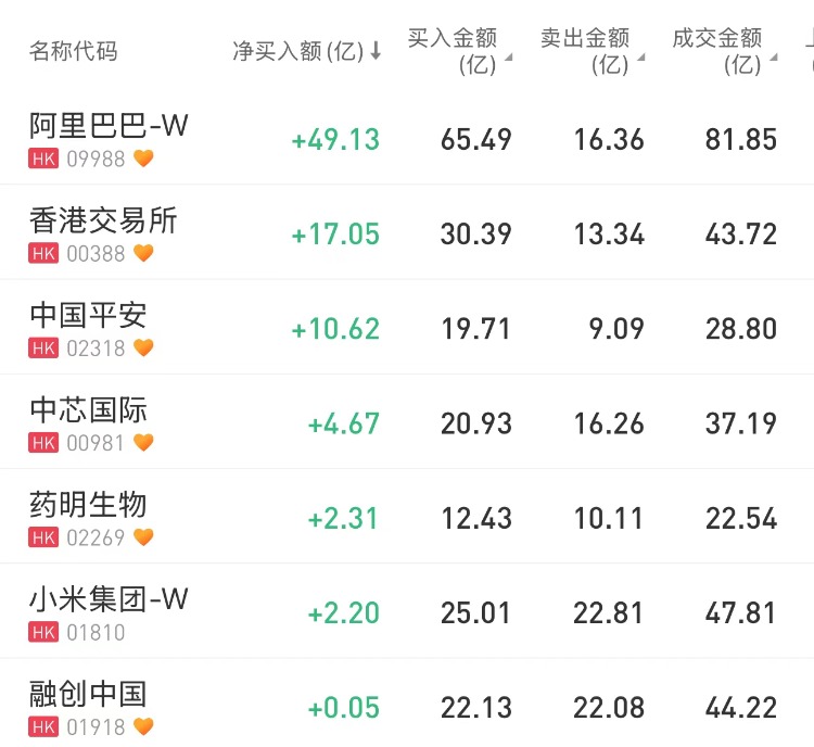 阿里巴巴-W、香港交易所、中国平安分别获南下资金净买入49.13亿港元、17.05亿港元、10.62亿港元;美团-W、中国移动、腾讯控股分别遭净卖出14.16亿港元、9.69亿港元、8.93亿港元。