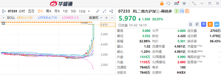 日本股市抢筹中国资产,在日本交易所上市的A股南方中证500指数今日收盘上涨77.8%,报6399点。此外,港交所上市的南方东英沪深300指数2倍做多产品 $07233.HK 涨超35%,南方东英恒生指数2倍 $07200.HK 做多产品涨超12.3%。