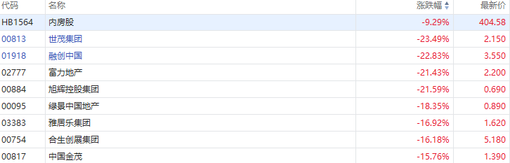 房地产股高开后转跌,融创中国、世茂集团、旭辉控股集团、富力地产跌超20%。