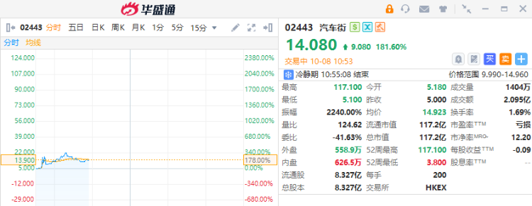 汽车街(02443)早盘股价走强,盘中一度突破21港元,涨近400%,盘中多次触发市调机制进入冷静期。截至发稿,涨234%,报16.7港元,成交额1.66亿港元。