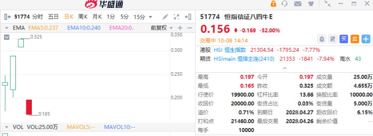 即市波幅较大,投资者宜将收回价放在较远的位置,或以较少的注码控制风险,可以留意收回价更远的恒指牛证( $51774.HK ),收回价两万点;淡仓方面,可以留意恒指熊证( $53791.HK ),收回价两万三千点。