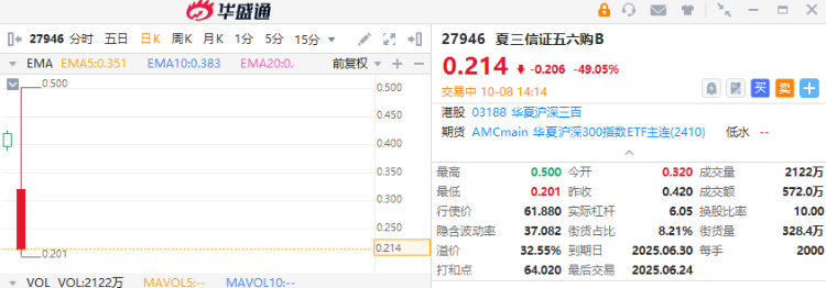 A股ETF同样获资金作博反弹部署,可以留意华夏沪深三百ETF( $03188.HK )的认购证( $27946.HK ),行使价61.88元,明年6月底到期,实际杠杆近6倍。