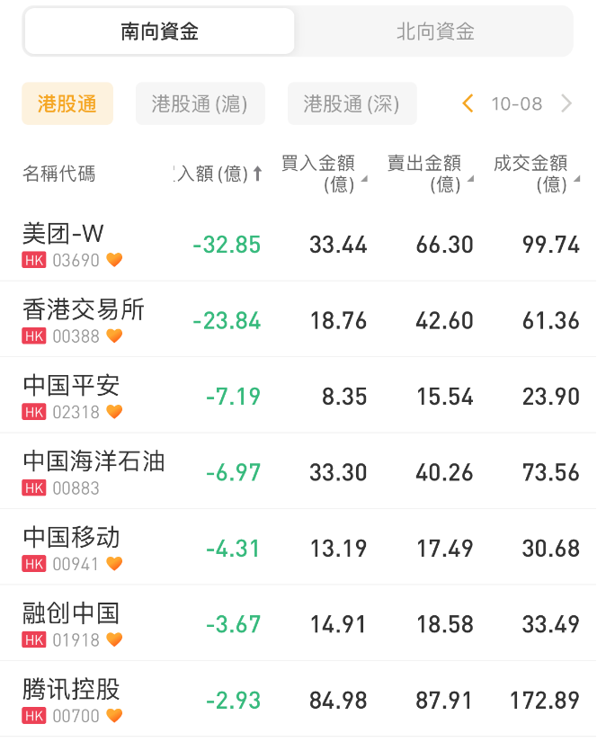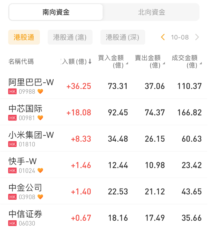 阿里巴巴-W、中芯国际、小米集团-W分别获南下资金净买入36.25亿港元、18.08亿港元、8.33亿港元;美团-W、香港交易所分别遭净卖出32.85亿港元、23.84亿港元。