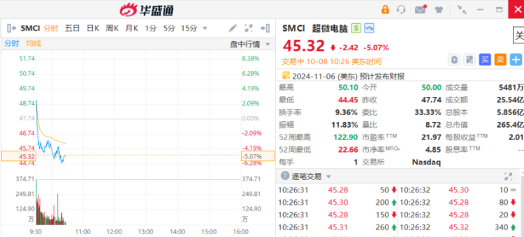 周二,超微电脑 $SMCI 股价走低,截至发稿,该股跌超5%,报45.27美元,该股昨日收涨近16%。