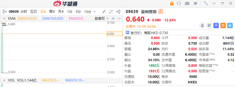 华盛资讯10月09日讯,港股荣利营造今日挂牌,截至发稿跌12.33%,报0.64港元/股,中签一手账面浮亏450港元,最新总市值超6.00亿港元。该股此前公开发售获120.57倍认购,一手中签率25.0%。