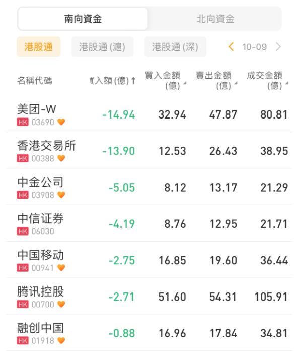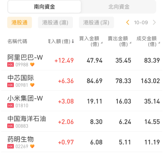 阿里巴巴-W、中芯国际、小米集团-W分别获南下资金净买入12.49亿港元、6.36亿港元、3.08亿港元;美团-W、香港交易所分别遭净卖出14.94亿港元、13.90亿港元。