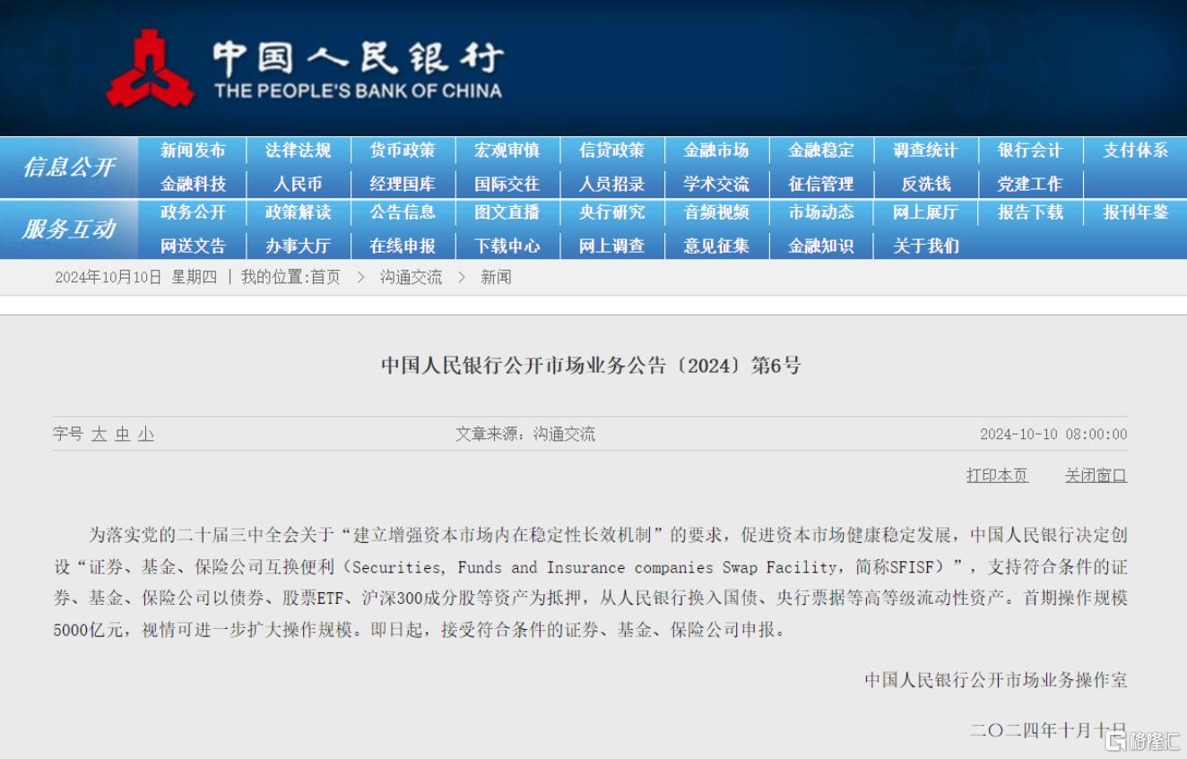 10月10日早间,央行公告,决定创设“证券、基金、保险公司互换便利(Securities, Funds and Insurance Companies Swap Facility,简称SFISF)”。