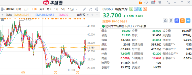 10月10日讯,零跑汽车(09863)高开近14%,截至发稿,涨13.92%,报36港元,成交额1102.95万港元。