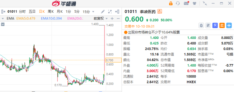 10月10日讯,泰凌医药(01011)复牌后高开250%。截至发稿,涨250%,报1.4港元,成交额1.4万港元。