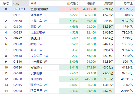科网股集体大涨,携程集团-S大涨逾6%,美团-W涨4%,京东集团-SW涨超3%,腾讯控股、阿里巴巴-W涨超2%。