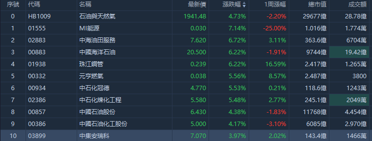 华盛资讯10月10日讯, 港股三桶油震荡走强,中海油田服务、中国海洋石油均涨超6%,中国石油股份、中国石油化工股份均涨超4%.