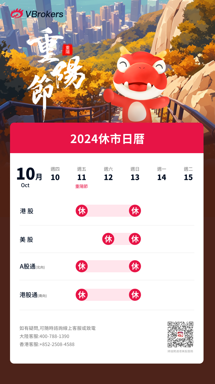 港股:10月11日(周五)为重阳节休市;10月14日起将正常开市。