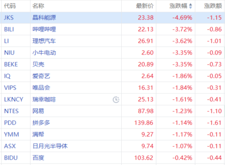 跌幅方面,哔哩哔哩、理想汽车、贝壳跌超3%,网易、拼多多跌超1%。