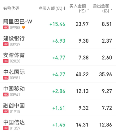 阿里巴巴-W、建设银行、安踏体育分别获南下资金净买入15.46亿港元、6.93亿港元、4.77亿港元;腾讯控股、快手-W遭净卖出7.75亿港元、6.15亿港元。