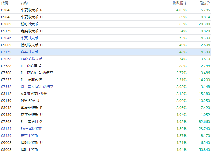 加密货币ETF继续走高,截至发稿,华夏以太币涨超4%;博时以太币、嘉实以太币涨超3%;嘉实比特币、博时比特币涨超1%。