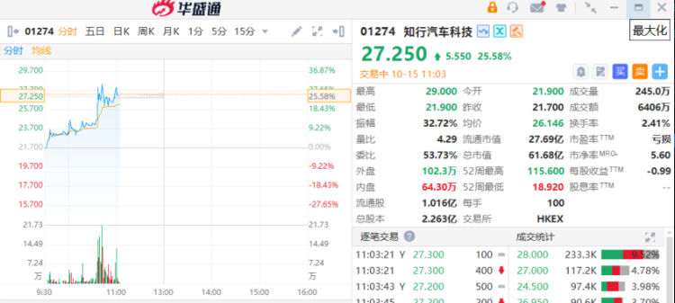 知行汽车科技 $01274.HK 逆市大涨逾25%,截至发稿,涨25.58%,报27.25港元,成交额6406万港元。