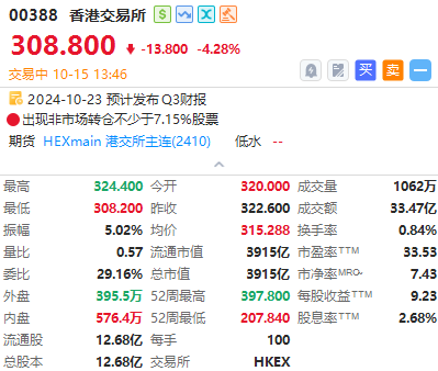 港交所(00388)午后跌超4%,截至发稿,跌4.28%,报308.8港元,成交额33.47亿港元。