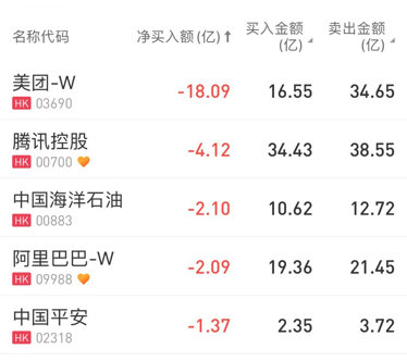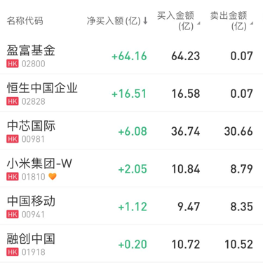 盈富基金、恒生中国企业、中芯国际分别获南下资金净买入64.16亿港元、16.51亿港元、6.08亿港元;美团-W、腾讯遭净卖出18.09亿港元、4.12亿港元。