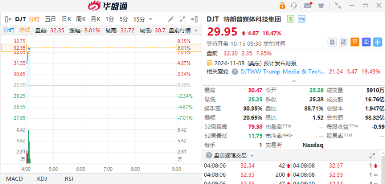 特朗普概念股盘前走强,Phunware、特朗普媒体科技集团涨超7%。