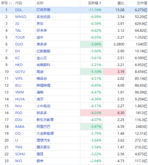 中概股集体下挫,截至发稿,叮咚买菜跌超11%,名创优品、京东、好未来跌超6%,金山云、高途跌超5%,唯品会、哔哩哔哩、拼多多跌超4%,阿里巴巴、理想汽车跌超3%。