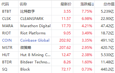 加密货币概念股上扬,比特数字涨近8%,MARA $MARA 涨超4%,RIOT $RIOT 、Coinbase $COIN 涨超3%。
