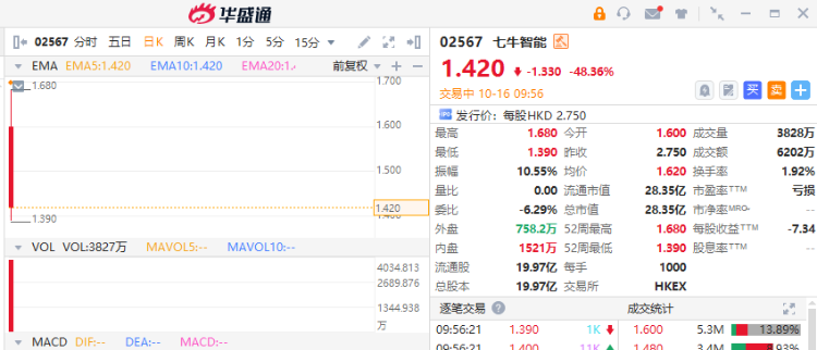 华盛资讯10月16日讯,港股七牛智能今日挂牌,截至发稿跌48.36%,报1.42港元/股,中签一手账面浮亏1330港元,最新总市值28.35亿港元。该股此前公开发售获19.87倍认购,一手中签率80.0%。