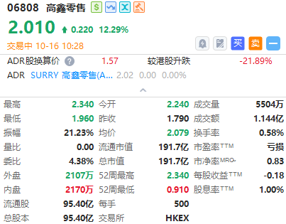 高鑫零售(06808)复牌高开逾25%,截至发稿,股价上涨12.29%,现报2.01港元,成交额1.144亿港元。