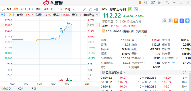 摩根士丹利第三季度净营收153.8亿美元,预估143.5亿美元;第三季度股票销售和交易业务营收30.5亿美元,同比增长21%。第三季度财富管理净收入为72.7亿美元,市场预期为68.8亿美元。第三季度机构投资银行收入为14.6亿美元,市场预期为13.7亿美元。截至发稿,该股盘前涨超3%。