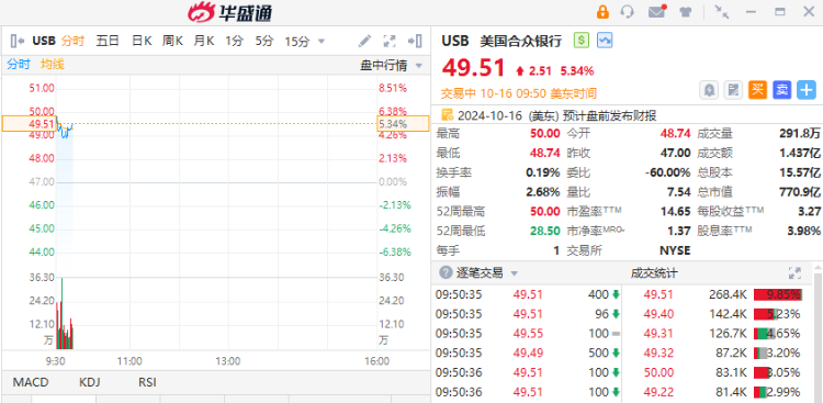 美国合众银行涨超5%,消息面上,美国合众银行第三季度净收入68.6亿美元,同比下降2.4%,市场预估69亿美元;净利润17.1亿美元,同比增长12.5%;调整后每股收益1.03美元,市场预估0.99美元。期内净利息收入41.4亿美元,市场预估40.4亿美元。