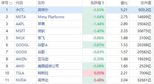 明星科技股多数走低,英特尔跌近4%,META $META 、苹果、微软等跌超1%。