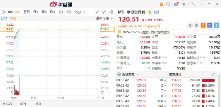 华盛资讯10月16日消息,美股早盘,摩根士丹利绩后涨超7%,股价创历史新高,第三季股票交易、固定收益及投行收入均超预期,利润同比增长32%至32亿美元。